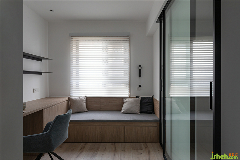 書房內(nèi)除了多人辦公長桌以外,我們還為屋主設(shè)計(jì)了一面置物架及一排卡座,夫妻二人可以選在在書房里或辦公或閱讀或聊天,可以同時容納夫妻二人在空間里同時進(jìn)行他們喜愛的事情。裝修設(shè)計(jì)