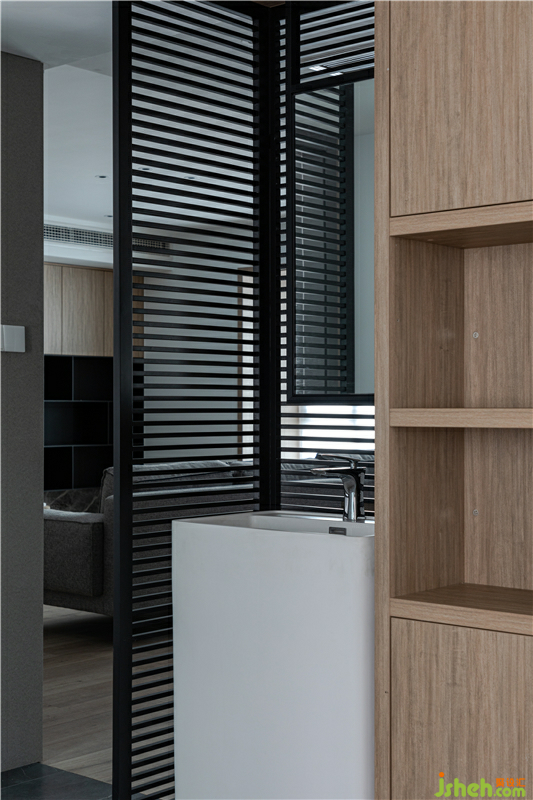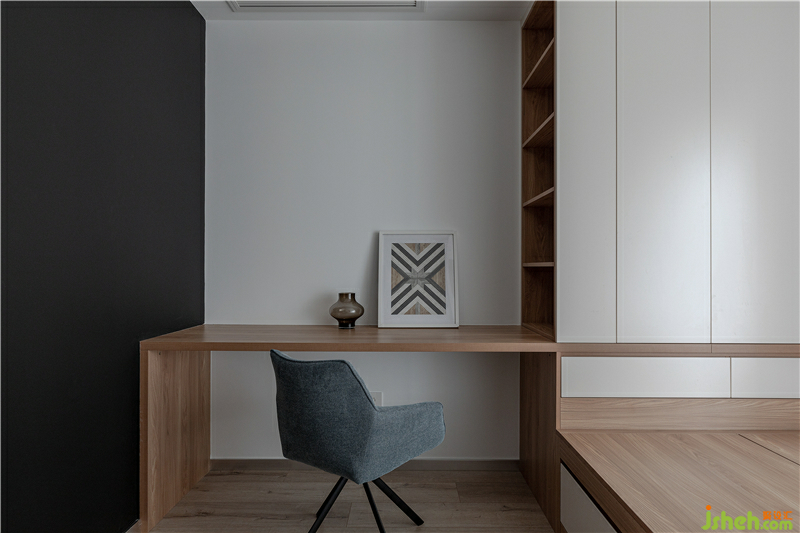 我們在綜合考慮后,將主臥的陽臺融入到了臥室,利用這個空間設(shè)計了一張單獨的寫字桌和收納柜用于存放毛筆、宣紙、顏料等,來滿足業(yè)主的個性需求。