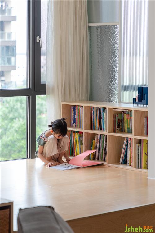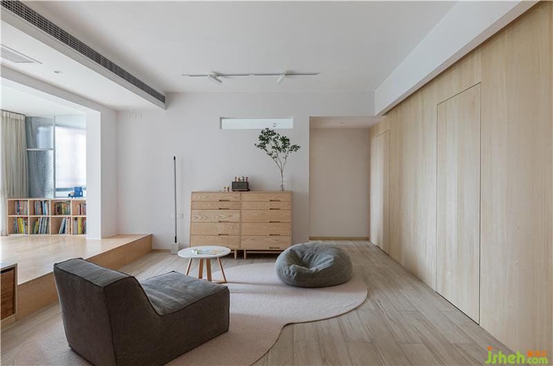 由于屋主對電視的需求度不高,通過去掉電視和電視墻占用的空間,增加了冰箱放置的空間。同時,冰箱上方考慮了置物的收納盒,可以把不常用的東西收納進去。家居裝修
