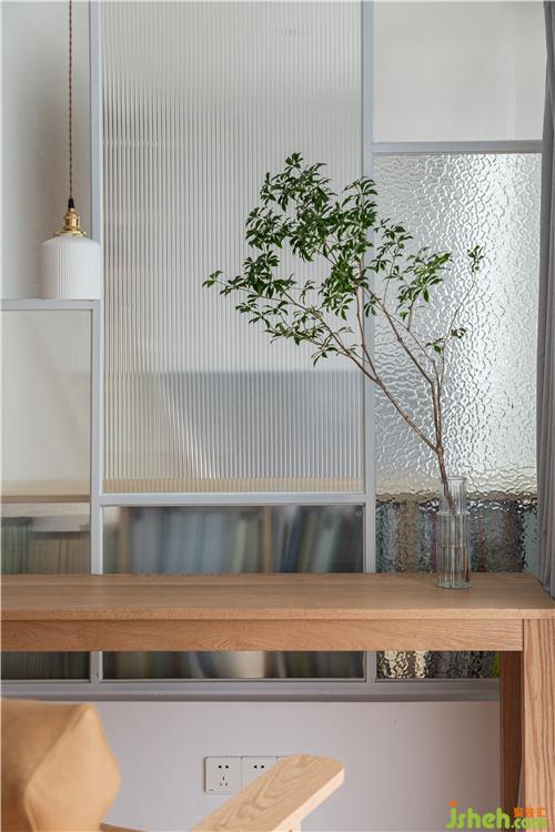 中間通過4種不同的藝術(shù)玻璃進行了隔斷,透光不透明。當父親在主臥的書房閱讀時,也能大致觀察到小朋友在客廳陽臺的活動。