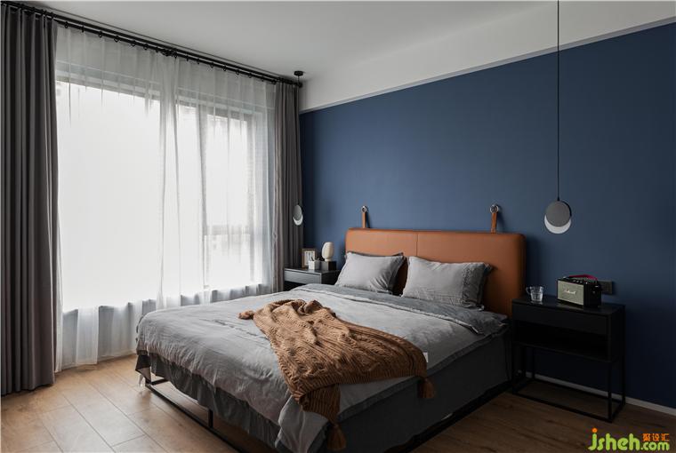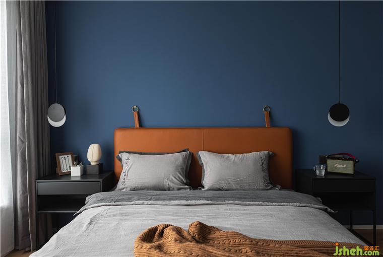 主臥的背景墻面刷了深藍(lán)色乳膠漆,烘托整個(gè)空間寧?kù)o,深邃,讓人完全可以放松下來(lái)。
