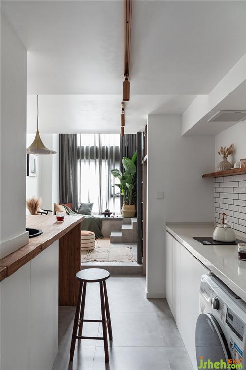 吧臺(tái)與餐桌相互結(jié)合,小水槽就近設(shè)計(jì)在吧臺(tái)上邊緣,無論是吃一份簡餐還是水果,有了它的存在就不用手忙腳亂的準(zhǔn)備食材和清洗餐杯、水果了。吧臺(tái)與對面櫥柜一起組成開放式餐廚空間,滿足使用者輕度餐飲,左邊的冰箱門上,寫著小兩口對即將到來的客人的祝福與期待。