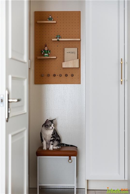 玄關(guān)拆除了原始開發(fā)商的鞋柜,根據(jù)業(yè)主的實(shí)際需求和使用習(xí)慣進(jìn)行了新的柜體設(shè)計(jì)。增加洞洞板+玄關(guān)柜的組合,收納一些日常隨身攜帶的鑰匙、包包、雨傘,進(jìn)門-換鞋-收鞋,一氣呵成。