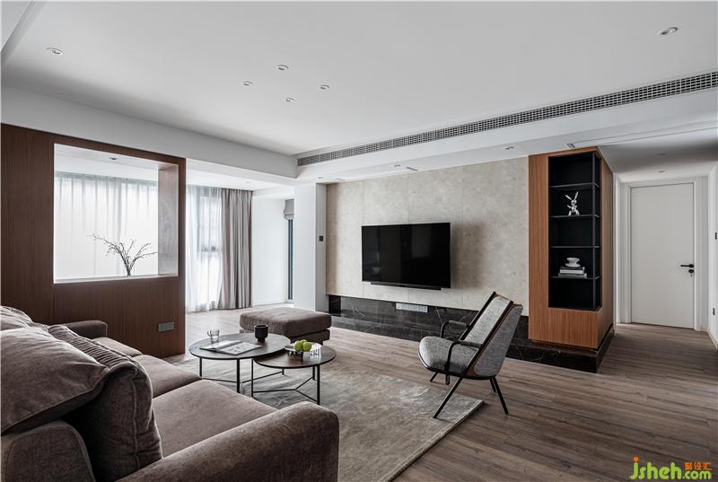 客廳處由于承重墻的限制,并沒(méi)有做過(guò)多的改造。設(shè)計(jì)的小心思放在了電視背景墻,室內(nèi)設(shè)計(jì)師選擇使用四種材質(zhì)碰撞,并將背景墻延伸至轉(zhuǎn)角過(guò)道處。同時(shí)背景墻后的兒童房,讓出小部分空間給到過(guò)道,使延伸至過(guò)道的電視背景墻,也擁有了強(qiáng)大的收納功能。
