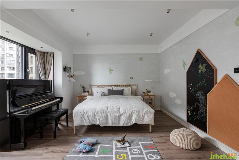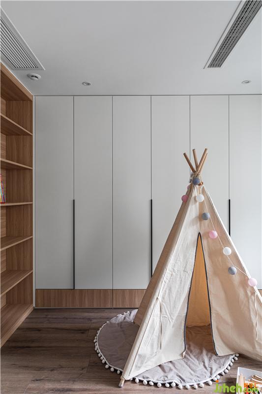 將兩個次臥打通后變成了現(xiàn)在的兒童房,最大程度的提升空間舒適性。既是睡眠區(qū),也是業(yè)主孩子布丁哥哥的游樂區(qū)及學習區(qū),一個房間包含了多種可能。由于布丁哥哥還小,所以更多的是大面積空間留白,讓孩子有足夠?qū)挸ǖ耐嫠^(qū)。游樂區(qū)旁設計了整面墻的柜體,方便玩具的收納。也沒有忘記空間與兒童的成長關系,窗邊也為長大后的他,預留了書桌與鋼琴的擺放位置。