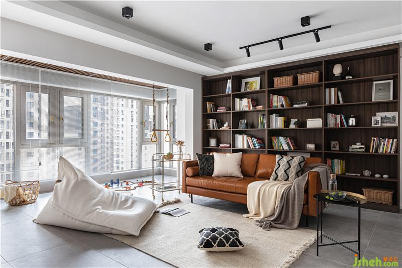 拆除了原本的陽臺推拉門,將陽臺空間納入客餐廳??蛷d沒有設(shè)置電視或投影儀,取而代之的是一整面大書柜。沙發(fā)的狀態(tài)是不固定的,既可以面向書柜,也可以面向一旁的白板墻,甚至可以面向陽臺與孩子一起玩?;印;野酌蘼橘|(zhì)地的懶人沙發(fā),是整個空間靈活調(diào)動慵懶舒適情緒的調(diào)節(jié)器。
