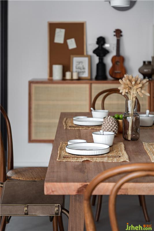 在戶型上,玄關(guān)、廚房、生活陽臺、衛(wèi)生間的結(jié)構(gòu)室內(nèi)設(shè)計師沒有做很大改造。主色調(diào)以黑白棕色調(diào)為主,餐廳擺放了一張大餐桌,輕松滿足全家的聚會,旁邊的餐邊柜承載了餐廳的收納。小推車可以滿載零食和酒水,靈活的服務(wù)于客廳或者餐廳。
