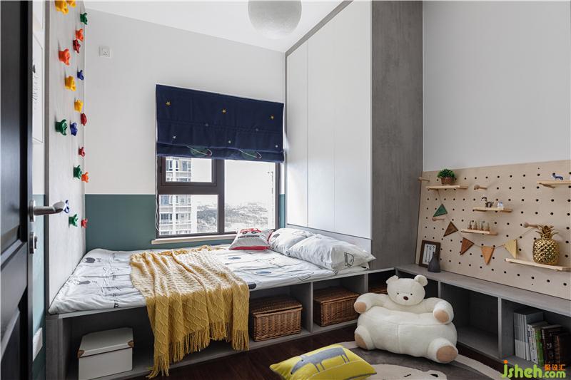 孩子的房間除了有一定的學(xué)習(xí)氛圍之外還應(yīng)給他們保留一些兒童純粹的天性。所以室內(nèi)設(shè)計師在榻榻米的衣柜對面做了一面不大不小的攀巖墻,讓孩子在這里攀爬消耗精力的同時也不會有太大安全問題。榻榻米的側(cè)面做了一圈開放的格柜,從小就可以培養(yǎng)孩子養(yǎng)成將玩具定時收納進(jìn)他們合適位置的習(xí)慣,也便于就近收納進(jìn)去。