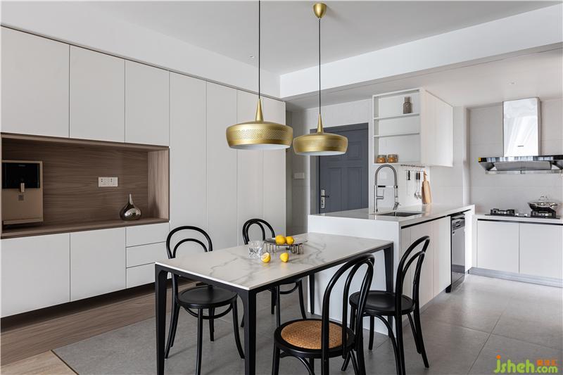 打通廚房與餐廳的隔斷,L型的廚房島臺從入戶處開始延伸。