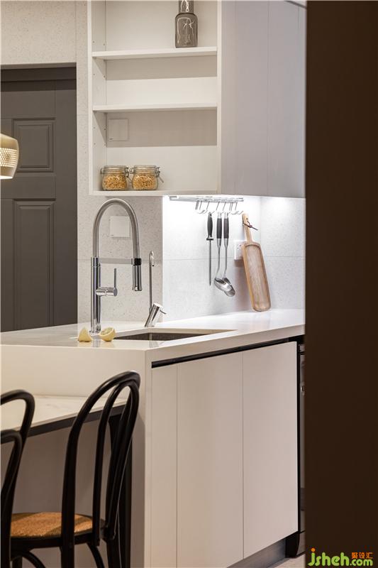 廚房沒有了遮擋物,視線自然通透。開放式的餐廚區(qū),一切以小舒顏的成長和安全出發(fā),無論孩子在何處,父母的視線都能緊隨其后。