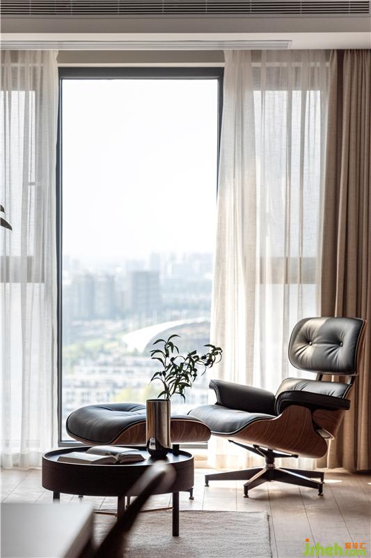 由于高層住宅四周無遮擋物的關(guān)系,日出到日落,不同時段的光線自由的在空間里野蠻生長。為了更好地保留窗外的景色,空間整體使用的都是相近色,光線交織著與空間產(chǎn)生了聯(lián)系。