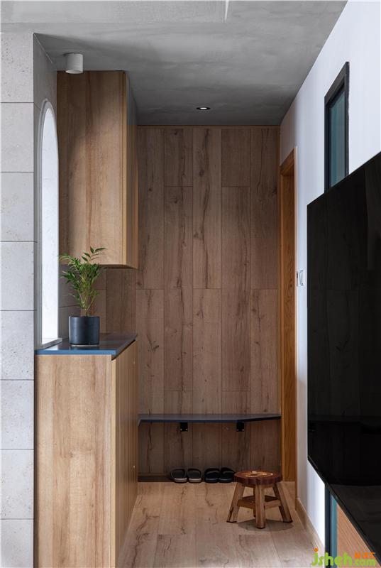 玄關(guān)處運(yùn)用了水泥漆與深色木紋的搭配,滿足男主喜歡的現(xiàn)代元素。由于他們喜歡坐著換鞋,所以我們室內(nèi)設(shè)計(jì)師設(shè)計(jì)一塊懸空的隔板作為換鞋凳,下方可以收納拖鞋以及換下的室外鞋。