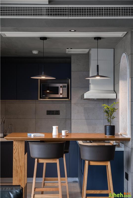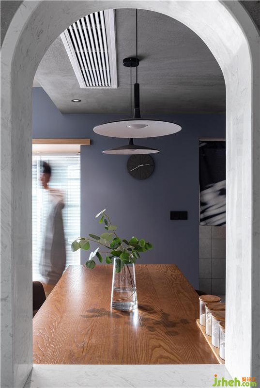 利用玄關(guān)至廚房的轉(zhuǎn)角,將餐廳與廚房進(jìn)了結(jié)合,把餐桌與島臺(tái)放在櫥柜上面,一個(gè)有儀式感與煙火氣的餐廚區(qū)就這樣誕生了。