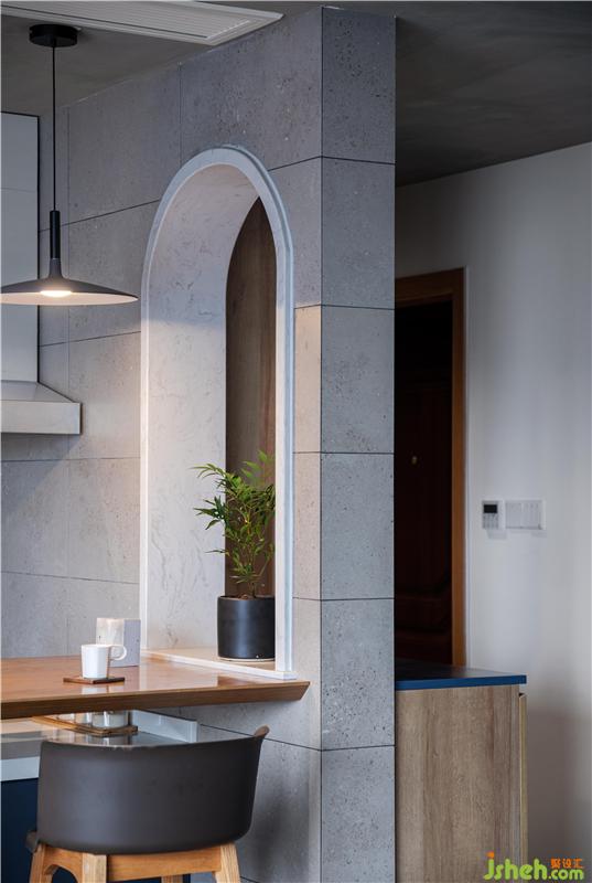 在設(shè)計(jì)玄關(guān)的時(shí)候故意把這個(gè)空間的色調(diào)調(diào)的比較暗,營造一場與明亮辦公環(huán)境形成反差的歸家氛圍,廚房與玄關(guān)的墻體之間利用石材做了鏤空的拱形造型。