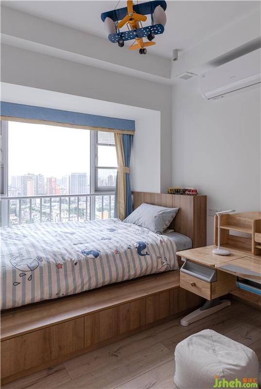 兒童房面積不大,所以室內(nèi)設(shè)計師考慮到孩子逐漸成長需要收納的東西會越來越多,于是把飄窗臺與榻榻米進行結(jié)合后,“偷”了部分空間形成了可收納床。富有童心的飛機燈,夜幕降臨后,窗外一眼就能瞧見都市的繁華與寧靜是孩子最好的繪本。