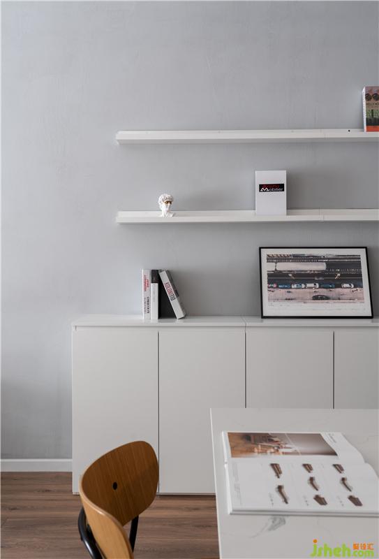 客廳把陽(yáng)臺(tái)作為閱讀區(qū)一起擴(kuò)入了室內(nèi),同時(shí)也作為客廳的補(bǔ)充座椅,投影儀更適合作為聚會(huì)與獨(dú)享下班時(shí)光的娛樂(lè)。