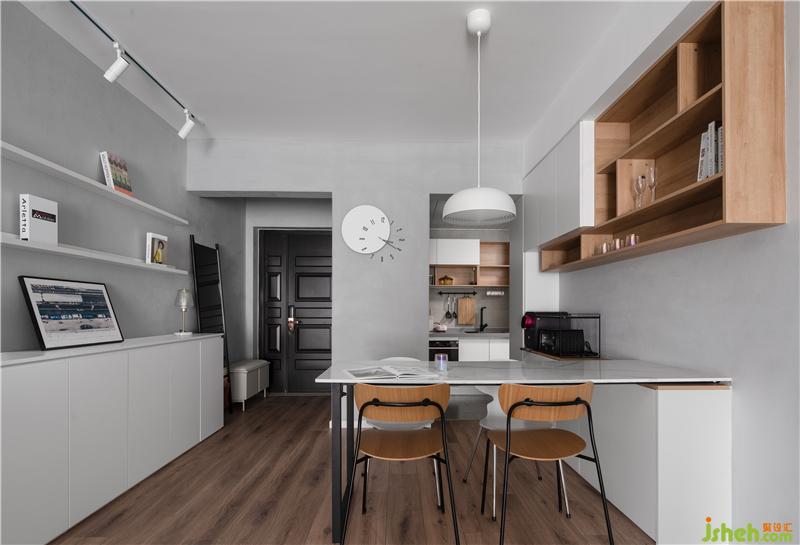 利用玄關(guān)至廚房的轉(zhuǎn)角,將餐廳與廚房進(jìn)了結(jié)合,把餐桌與島臺(tái)放在櫥柜上面,一個(gè)有儀式感與煙火氣的餐廚區(qū)就這樣誕生了。