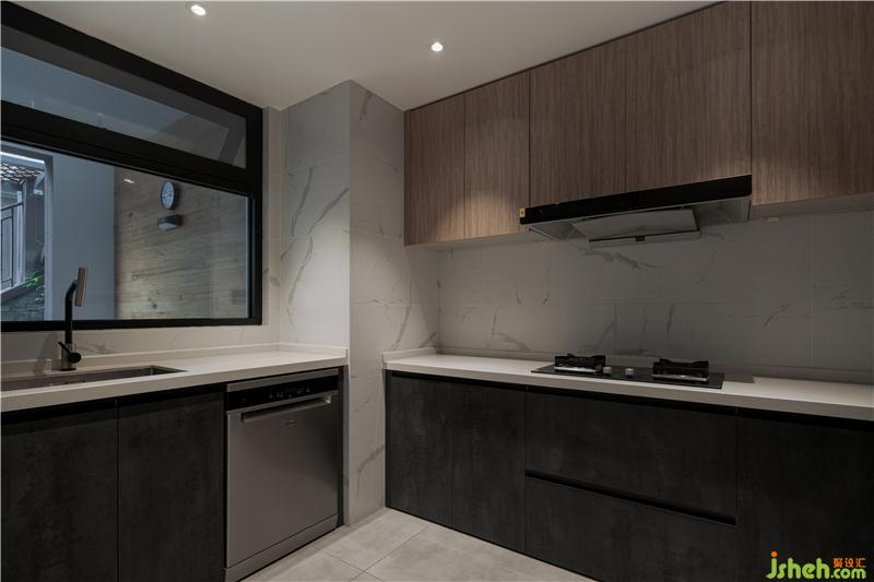 因為戶外樓梯的關(guān)系,廚房整體采光都不太理想,這也是整體1樓的弊病。所以玻璃窗是作為自然采光不足時的最優(yōu)解決辦法。當桃子姐和家人在廚房烹調(diào)時也能透過玻璃窗及時迎接歸家的親人或來訪的客人。