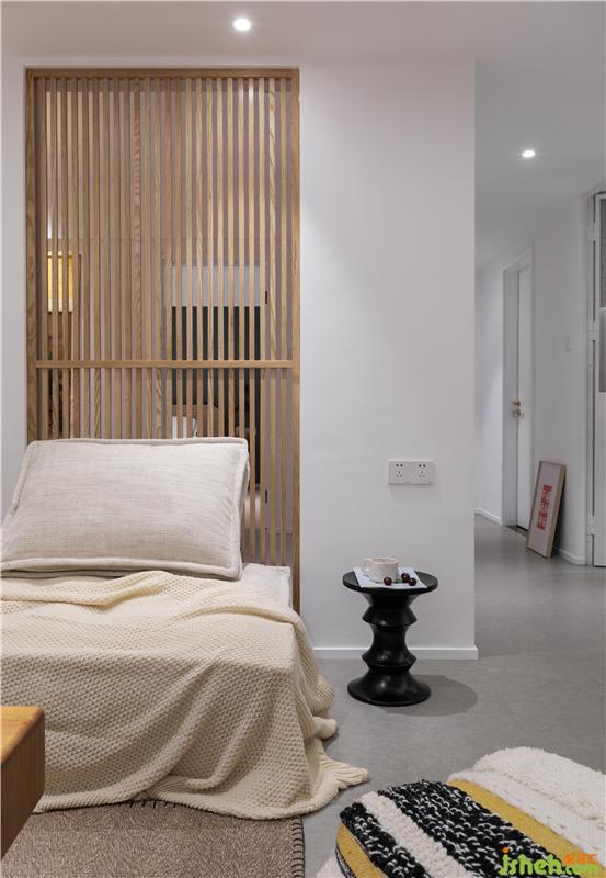 連接客廳與茶室的隔斷利用一扇木格柵,從而達到視覺上的空間延伸。正對窗戶的墻面以置物架的形式作為全家福和100多本書籍以及茶室物品的“家”。