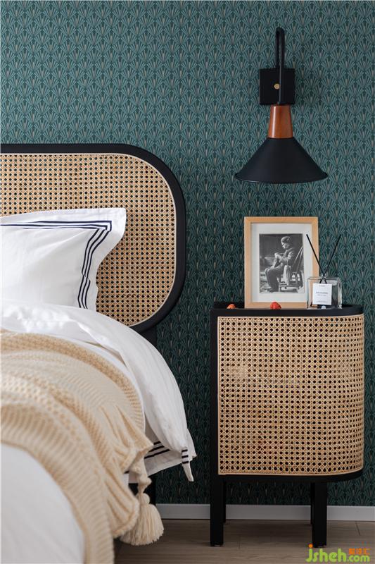 床頭背景墻我們選擇了奧麗芙的復古鎏金細節(jié)圖案的藝術(shù)墻紙,也是整個主臥空間的點睛之筆。AB款的藤編床頭柜相互照應(yīng)且獨立。