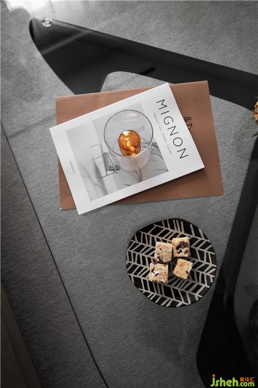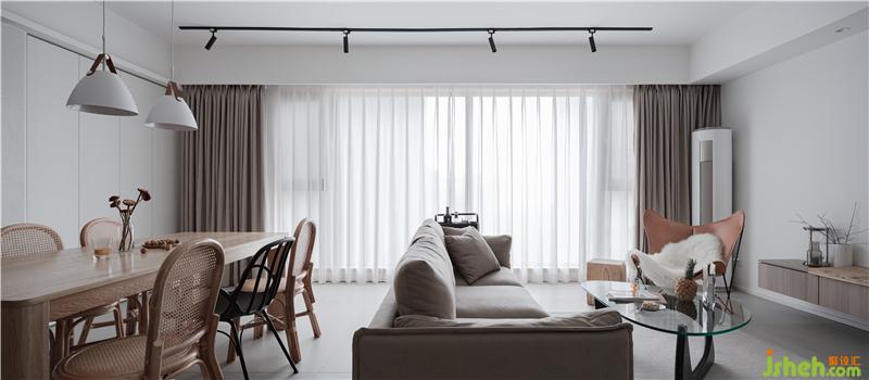 沙發(fā)、窗簾的面料與地毯選擇了鄰近色搭配,增加實木、真皮等元素自然感直接拉滿,而少量玻璃、金屬等元素共同構成“自然”與“現(xiàn)代”的沖撞。