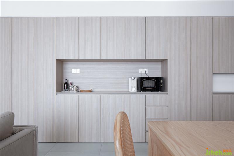 多功能集成柜,從左到右依次為書柜/展示區(qū)、中小雜物區(qū)、餐邊柜區(qū)、鞋柜區(qū)。而餐邊柜部分更是兼顧著起居和餐廚兩個區(qū)域的高頻使用。在柜體材質(zhì)上選擇了偏灰的直紋板材,造型簡潔硬朗。
