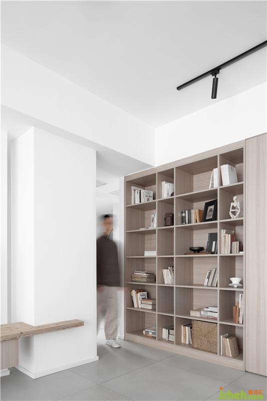 集成柜也成為了一片小型閱讀角,將原本在房間的書籍疏解到公共區(qū)域。