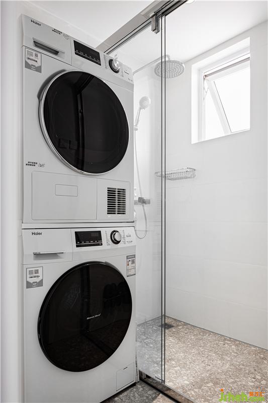在浴室中規(guī)劃了更衣區(qū)域,洗衣機+烘干機,洗澡前換下的衣物可直接放進洗衣機,做到及時清洗及時烘干存儲。