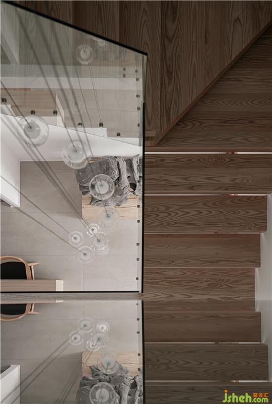 “天井”將各層空間的聯(lián)系變得更加緊密,吊燈引導(dǎo)居住者的視線自上而下望向一層,靈感來源于周邊自然景觀。