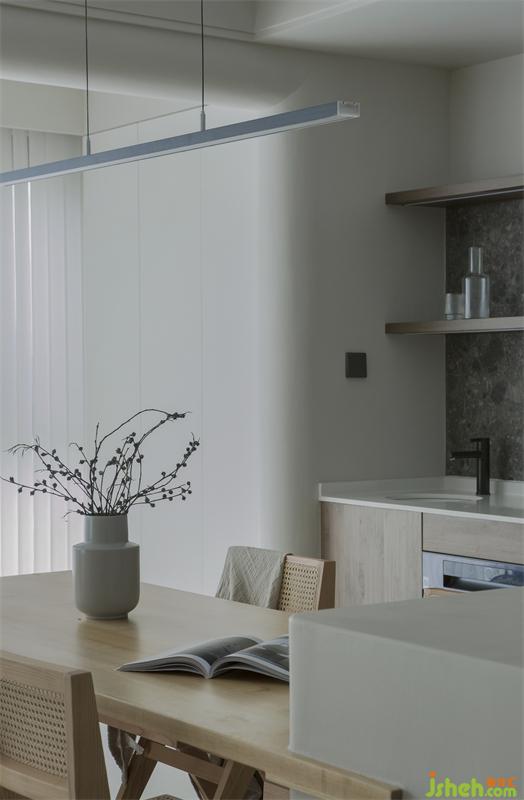 開發(fā)商提供的玄關(guān)柜設(shè)計(jì)不合理且不實(shí)用,選擇拆除重做后的柜體風(fēng)格更簡潔統(tǒng)一。餐廳由一整面墻的收納,與帶島臺(tái)的實(shí)木餐桌組成。