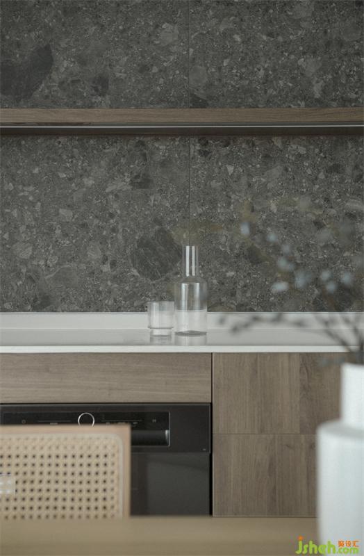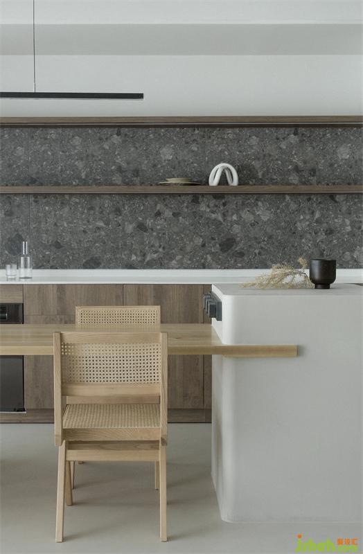 墻面和現(xiàn)場制作的島臺(tái)都選擇使用這種材料,來實(shí)現(xiàn)我們想要在公共空間表達(dá)的干凈與侘寂。