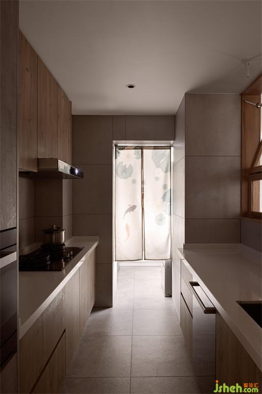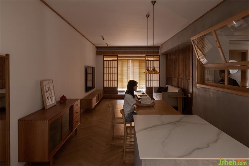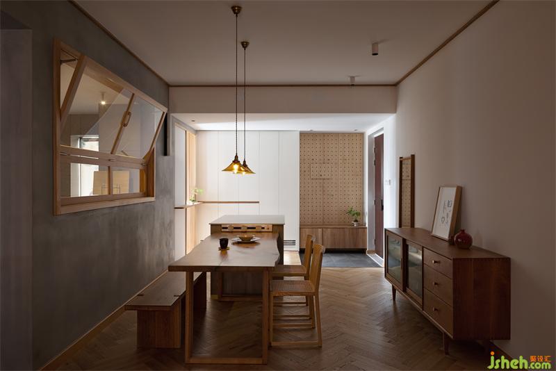 選擇紋理細(xì)膩、顏色溫潤的櫸木作為廚房半開放式窗框這兩個區(qū)域的主要木材,中和了老木材的穩(wěn)重與年代感。