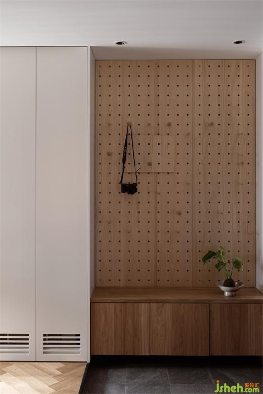 玄關(guān)選擇了淘寶定制的高性價比松木洞洞板,和自有品牌U然木作的5門定制收納柜,以組合的形式滿足入戶區(qū)域的公共收納。