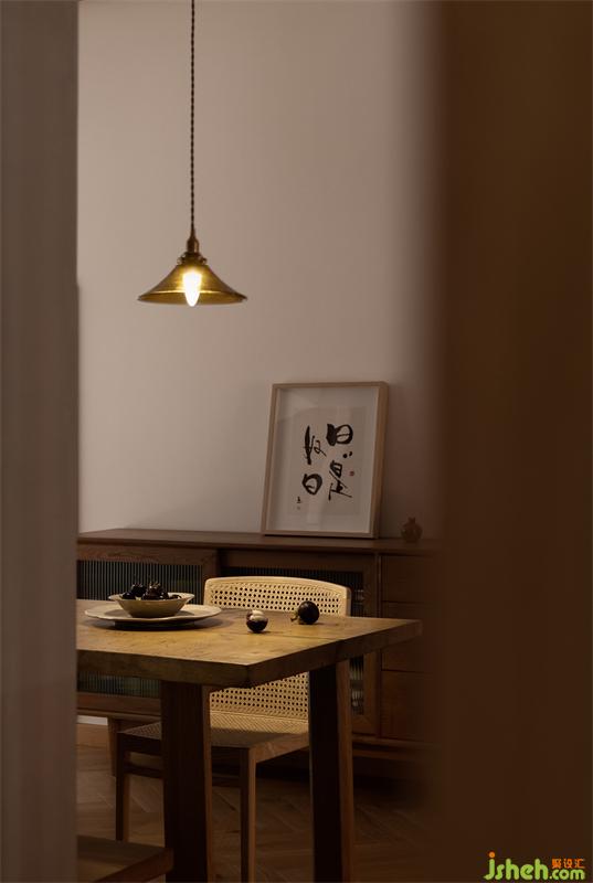 島臺+餐桌的組合大大的增加了餐廳利用率,島臺日常也被屋主作為放置茶具品茗使用。2張?zhí)倬幉鸵闻c長條木凳,滿足4-6人的用餐需求.搭配櫻桃木定制斗柜作為餐邊柜補充餐區(qū)收納。