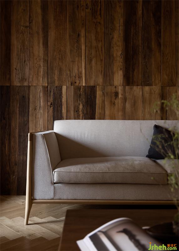 沙發(fā)背景墻的老榆木,是從二手市場淘回來的。在保留其原貌的基礎(chǔ)上,做了一些防腐防潮措施后上墻,與梵幾的木框兩座沙發(fā)呼應(yīng)。