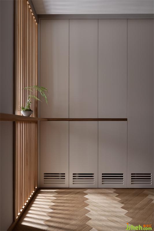 選擇自然且觸感溫潤的櫸木做格柵,分隔玄關(guān)與生活陽臺。保證玄關(guān)兩側(cè)采光的同時,也可保證美觀與空間的獨立性。