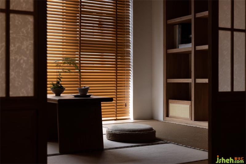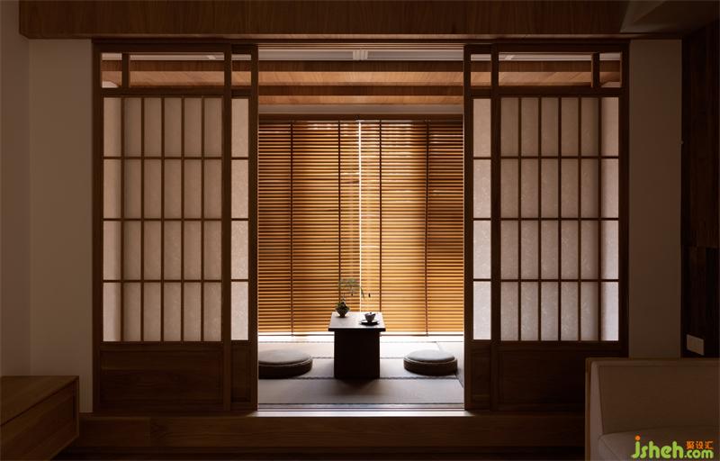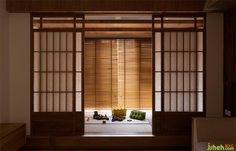 將原休閑陽臺(tái)塑造成多功能室,傳統(tǒng)古樸的推拉門運(yùn)用了傳統(tǒng)日式榻榻米推拉門的做法,以樟木和障子紙形成了多功能室與客廳的隔斷。
