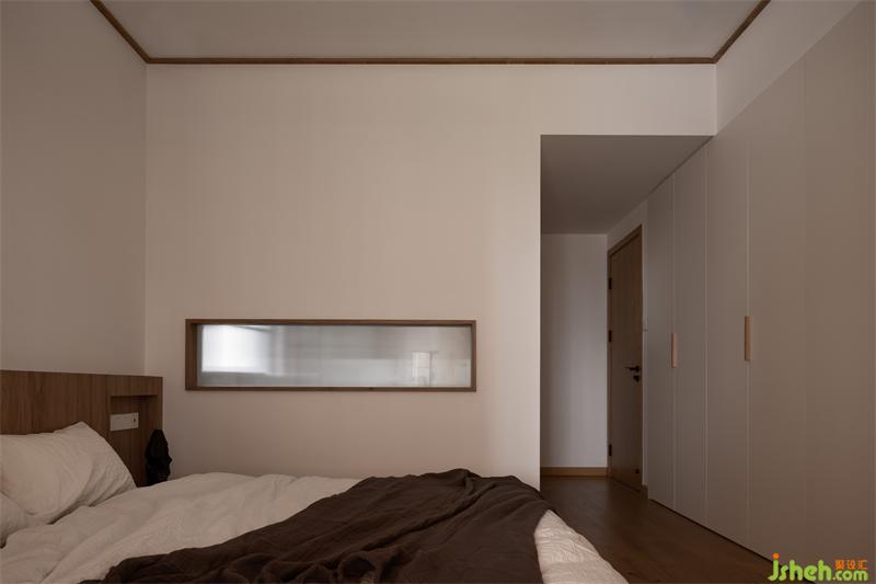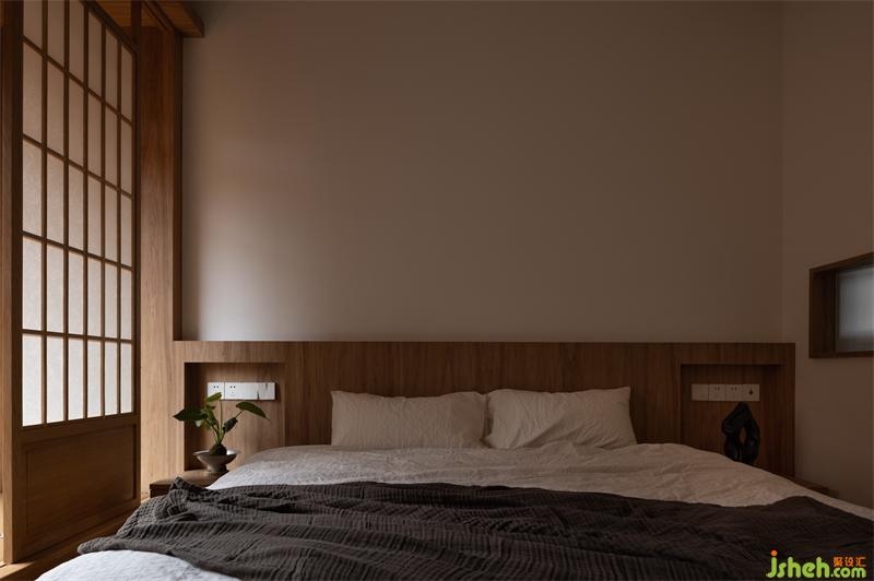 主臥的床也是實(shí)木定制,榆木的木質(zhì)感強(qiáng),木紋與顏色都恰到好處,不會(huì)過深也不會(huì)過淺。床沿的高度與榻榻米陽臺(tái)齊平,不會(huì)過于突兀。