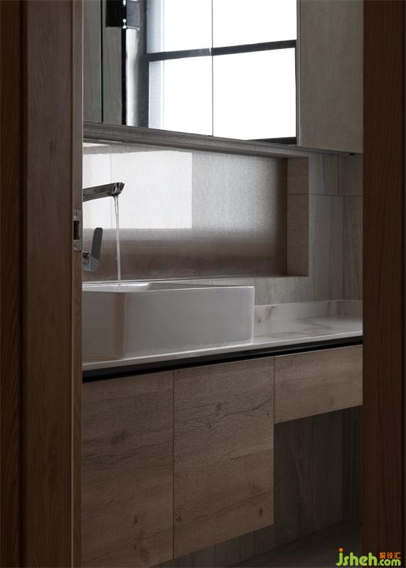 成都家居設(shè)計(jì),在主臥與主衛(wèi)洗手臺(tái)隔斷留一扇窗,利用長虹磨砂玻璃的優(yōu)點(diǎn),讓室外的自然光可以緩緩的進(jìn)入室內(nèi),解決因原始房型造成采光不足的情況。