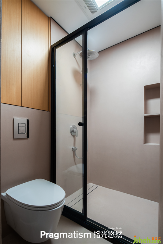 拾光悠然設(shè)計沿著進門右手邊的弧形墻體,推開與墻面同色的隱框門,即進入衛(wèi)浴區(qū)。衛(wèi)浴區(qū)吊頂脫縫產(chǎn)生懸浮感,墻面和地面全部使用微水泥,質(zhì)感自然細膩,通體無縫更美觀。