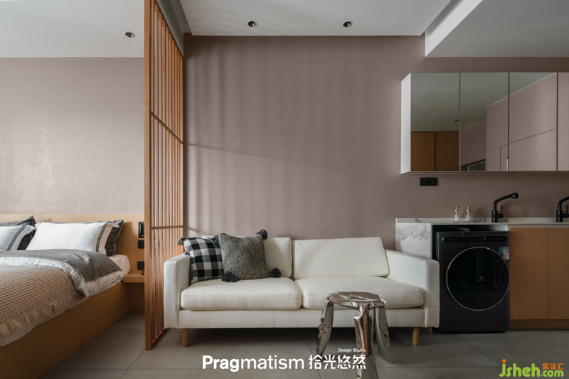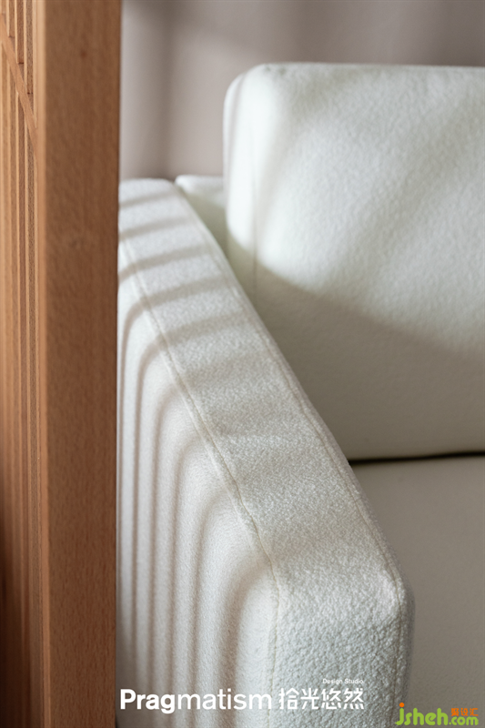 客廳區(qū)域面積較小,因此要盡量選擇小型家具。2~3人的象牙白沙發(fā)既可舒服躺臥,待客時也不顯局促。格柵作為客廳和臥室的隔斷,不妨礙整個空間的采光,保證通透感,明暗相間的光影效果也成為房屋中一處別樣的景致。