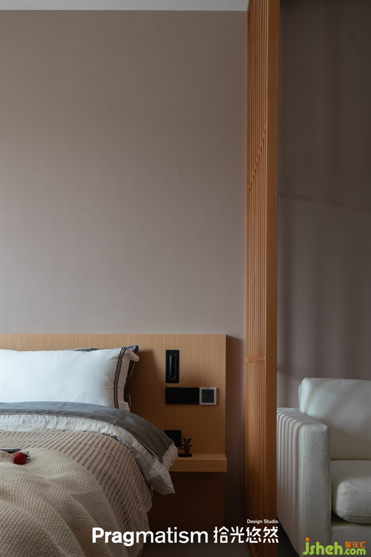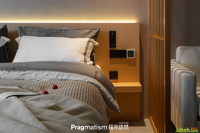 床頭背景做弧形造型,與入戶的弧形墻體相呼應(yīng);可彎折的硅膠燈帶嵌入其中,一同組成流暢線形,更好的發(fā)散性也烘托出一人居的溫暖。嵌入式的小臺燈和移動插座,使用更加便捷?,F(xiàn)場木作的落地床,不留衛(wèi)生死角。