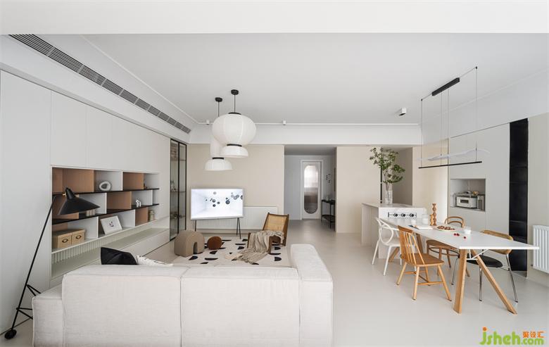 材質上以棉麻、藤編、木質、百葉為主,搭配少量的紙質、金屬。配色上則以奶茶裸色為基調,家裝設計加入原木色系的木質、柔軟的紗麻,加上少量的黑灰色點綴,整個空間舒適而治愈。