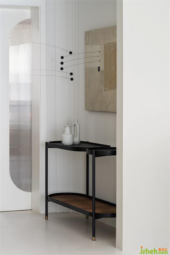原始入戶位置是一排鞋柜,現(xiàn)在將置鞋的功能轉移到門外,在原來的位置放置裝飾玄關柜。家裝設計利用波紋板做弧形造型,巧妙遮擋住強弱配電箱,同時配合黑色吊飾和簡約色塊裝飾畫,打造奶茶系暖居的第一站。