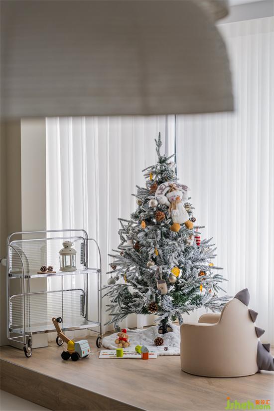 圣誕期間,屋主為新家搬來(lái)了一棵圣誕樹。這兒原本是空調(diào)機(jī)位,因?yàn)榕P室改成書房后不再需要空調(diào),家裝設(shè)計(jì)便將這一部分包進(jìn)來(lái),改為地臺(tái),把原本的下水管進(jìn)行包裹處理。