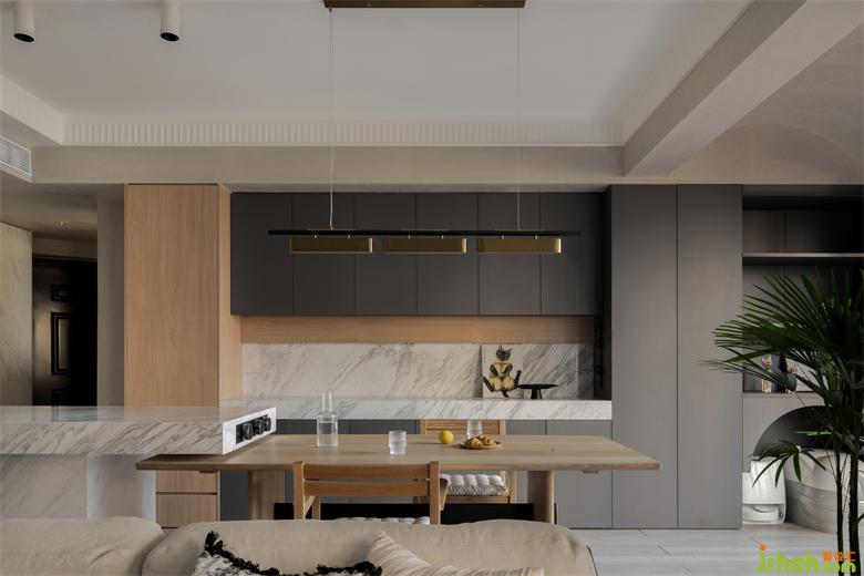 異形島臺為現(xiàn)場制作,側(cè)面留有軌道插座,成都家裝設(shè)計(jì)底部留有儲物柜。島臺高度略高于餐桌,餐桌抽出后可增加3個就餐位,親朋聚餐一點(diǎn)也不局促。