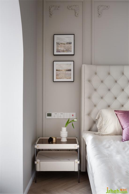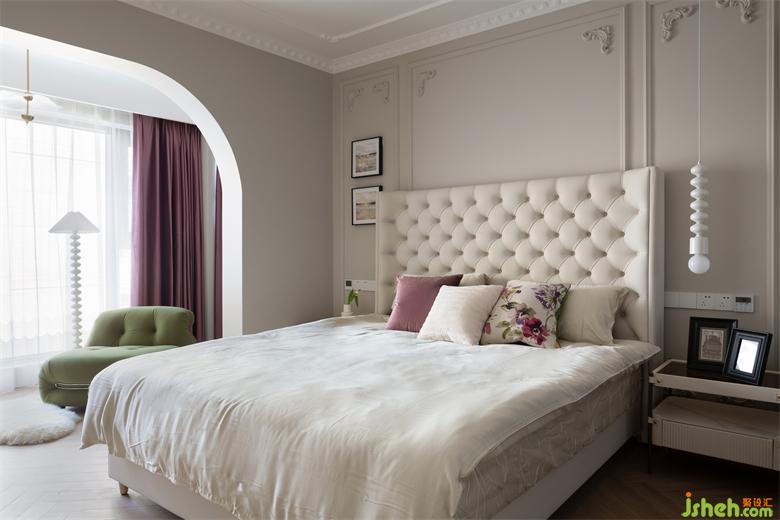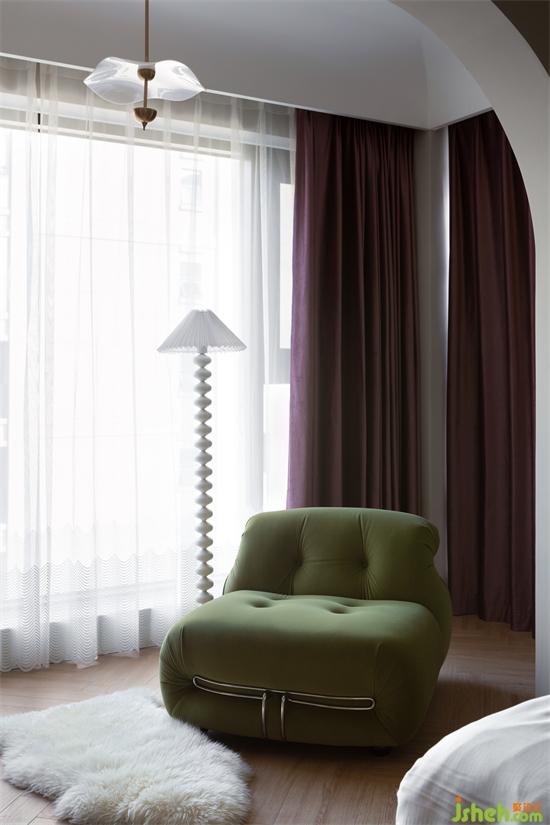 淡雅的白色,配合法式軟包床,給臥室戴上了奶油慕斯般的濾鏡,裝修設(shè)計(jì)綠色鋼牙沙發(fā)和紫色窗幔又十分搭調(diào)地為空間注入亮色。