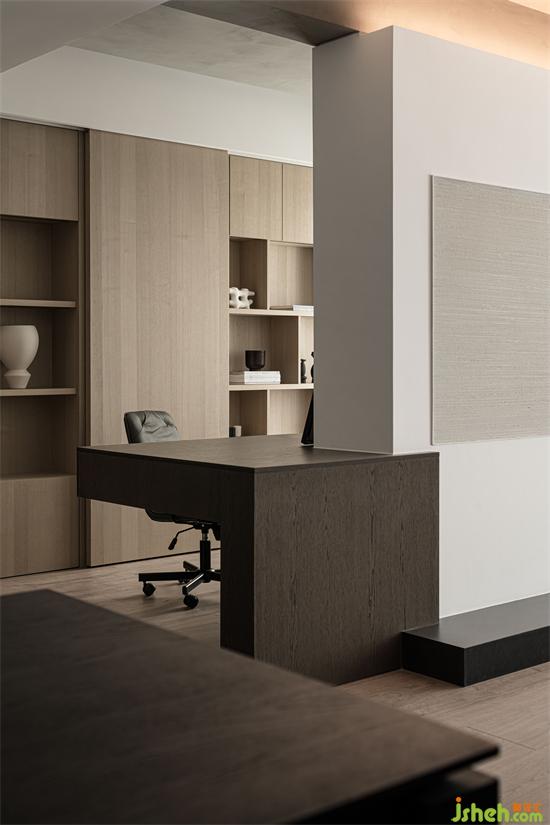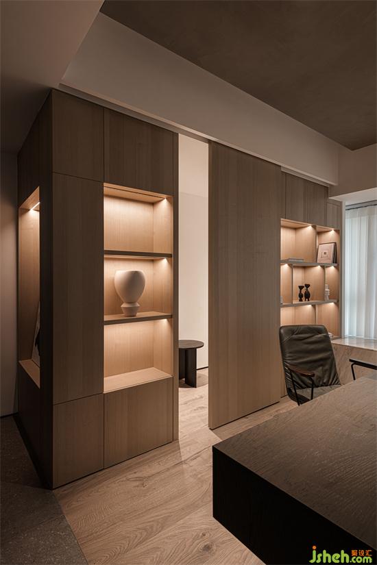 家裝設(shè)計根據(jù)屋主的儲物需求,在書房圍合出一間儲藏間,便于收納暫存物品。移門一合,生活里的瑣碎之物全部隱藏身后。