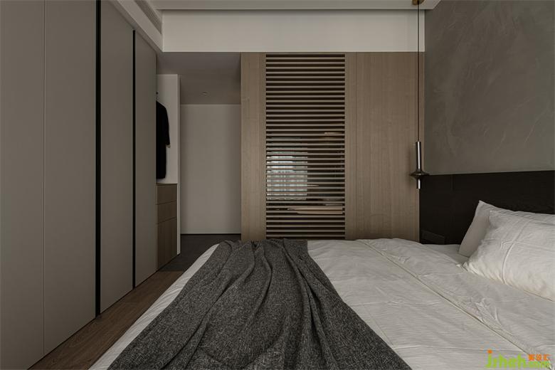 主臥延續(xù)了公區(qū)的沉靜氛圍,黑白灰與木質(zhì)元素相融合,眼睛和身體可自然放松,更宜入睡。