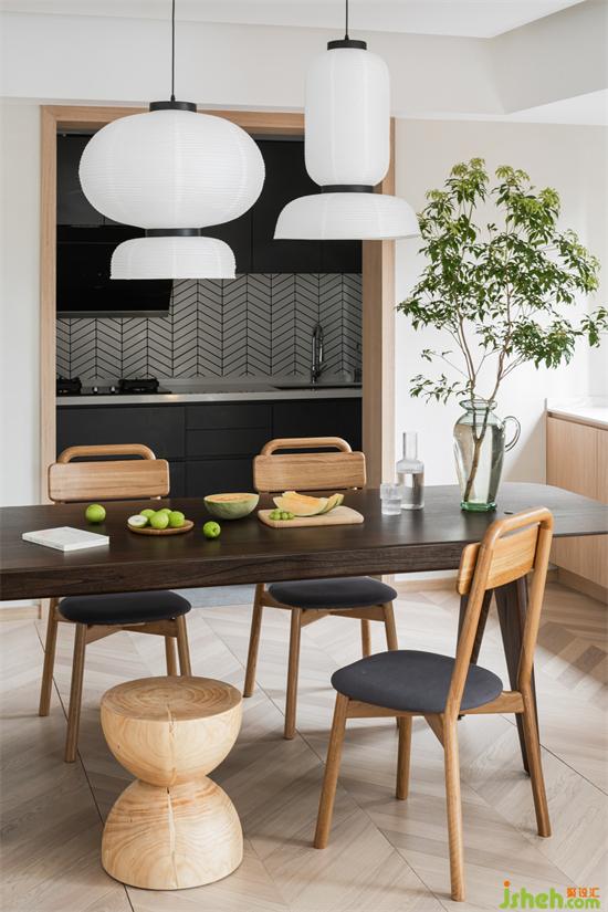 透過餐桌,西廚柜體覆蓋餐廳最好的采光處,家裝設(shè)計收納在這里占有重要的位置,同時,水槽洗碗機(jī)也在這里發(fā)揮著它最大的作用。